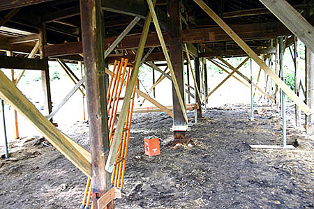 このときに偶然にも、台風が接近してきました。建物は足を切られたような状態なので、雨風に耐えられるよう、しっかり補強する必要があります。しかし、さすがプロの大工さんは手慣れたもの。半日もしないうちに、建物のまわりを材木で補強しました。筋交いも入っているので、これなら台風がきても大丈夫。