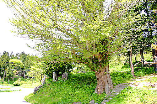 イチョウの美しい季節は、やはり黄色い落ち葉が絨毯のように広がる秋でしょう。でも、春先の新緑の季節も美しいものです。さて、今回の写真で登場したイチョウですが、都路の頭の巣(つぼりのす)という地域にあります。別名・乳イチョウともいわれますが、枝から垂れ下がった突起が特徴的で、たいへん珍しいものです。実はこの木には言い伝えがあり、「隣家の高橋末吉の祖・栄蔵が南部藩に粗鉄を仕入れにいった際に記念に買ってきて植えたもの」と村史にあります。いまから約200年前の話で、ここでは当時、製鉄が盛んで、南部藩とは船で交流していたようです。その名残はもうありませんが、唯一、このイチョウが岩手との結びつきを物語っているのです。