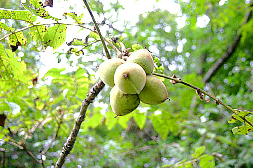 夏に大きくなるクルミの果実。見た目にかわいいです。