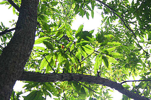 その樹木ですが、北海道から九州までの温帯に広く分布しています。高さ20m以上にも達する落葉高木で、どっしりとした樹木です。樹皮は灰褐色で平滑ですが、年輪を重ねることで暗褐色となり、縦に裂け目が出てきます。楕円形の葉は大きく、羽状複葉で軟毛が生えています。陽の当たる場所を好み、成長が早いのも特徴です。クルミの名の由来は黒い実、くるくる転がる実、中国の呉からきた実、また山地の川沿いに自生するオニグルミは核の表面が凸凹で醜い、中国の鬼胡桃をそのまま日本語読みした、などの説があります。6月頃に開花し、秋になると果実が熟します。