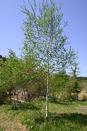 高さが20m以上にもなる落葉高木ですが、普通は1代限りで消えます。幹の直径は30cm〜1mほどで、真っ直ぐに伸びるのが特徴です。たくさん枝を伸ばし、全体的には卵形の樹幹になります。葉の周囲はギザギザしており、形は菱形または三角形に近い卵形。秋には黄色く紅葉します。白い樹皮は光沢があり、紙のように剥がれます。花粉を雌しべまで運ぶのに風を利用する風媒花の1つで、北海道では花粉症の主な原因だとか。東北でその話は耳にしません。