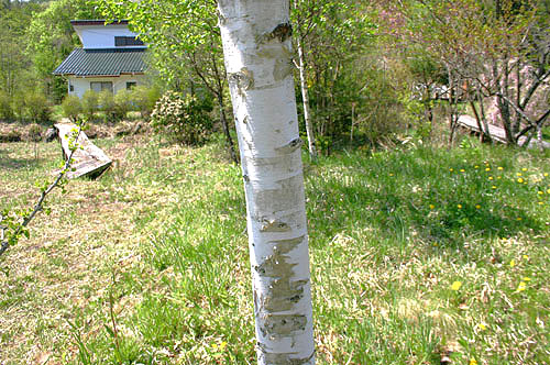 シラカバは高原の代表的な樹木。北海道や長野でよく見かけますが、阿武隈山系でも敷地に植えている移住者が少なくありません。日本では福井が西端、静岡が南端となっており、もちろん福島でも見かけます。正式名称はシラカンバで、シラカバはそれを略したもの。和名は白い樺の木という意味です。シラカバは山火事のあとに真っ先に生えるという性質があり、その生命力の強さからパイオニアツリー(先駆者)とかナースログ(保護樹)とも呼ばれています。明るい場所を好む陽樹で、白い樹皮が青空によく映えます。