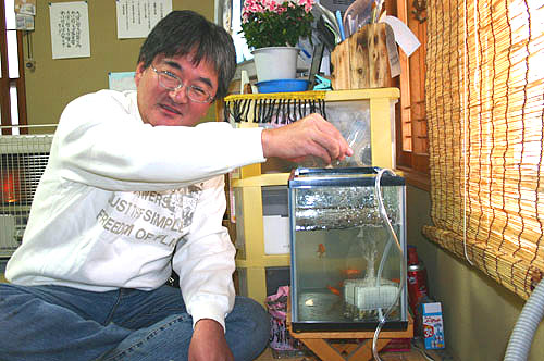金魚に餌をやる山本さん。これが癒しのひとときに。