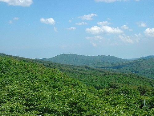 緑に包まれた阿武隈山系。丘陵の山並みが連なる
