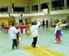 都路村古道地区の盆踊り。雨天のため体育館で太鼓に合わせて踊りました