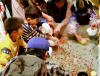 都路村地見城地区のお祭りも雨天のため公民館で。輪投げで子どもが大はしゃぎ