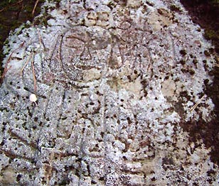 片曽根山の山頂付近には、もう1つの見どころがあります。山頂から50mほど下がった岩山に、三十三観音が彫られているのです。以前に紹介した「岩角山岩角寺」の仏画に比べると規模は小さいのですが、それにしても素朴な力作です。誰が彫ったか正式には定かでありませんが、案内看板によると江戸後期に麓に住んでいた辰治という男が病にかかり、それを治そうと観音様にすがって彫り上げたもの。二年の歳月をかけて念仏を唱えながら来る日も来る日も掘り続けたところ、病気がすっかり治ってしまったのだとか。その仏様は愛らしく、思わず微笑んでしまいます。 |