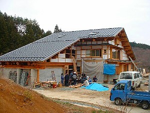 山村の基幹産業はもともと農林業でしたが、第一次産業の衰退とともに土木建築業へと転換いたします。同時に、各種の下請け工場などが全国に建設されました。しかし、平成の大不況で工場の閉鎖が相次ぎ、公共依存の土木建設業も苦境に立たされています。そういう時代背景の中で、当社は補助金に頼らない内発的事業に取り組んできました。お陰様でこの大不況にもかかわらず10数名の雇用を確保し、社外的にも地元の大工さんなど土木建設関係者に多くの仕事を提供していただく結果となっております。