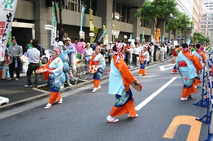 17日はビルの外が歩行者天国となり、そこで「全国ふるさと物産展」や「花笠音頭」などのアトラクションも行われました。大手町という場所柄、週末に大勢の人が行き交うという光景ではなかったものの、都会の人には充分にふるさと気分を味わってもらえたことでしょう。 |